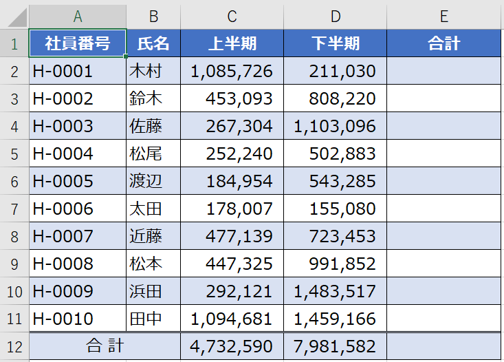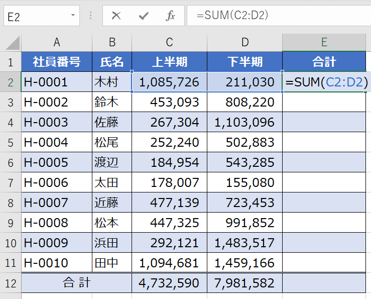 例えば、E2セルにSUM関数を使って合計を出すとします。それをオートフィル機能でE列の他の行にも反映させてみましょう。