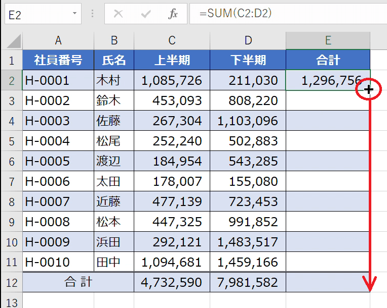 E2セルの右下にマウスポインタ―を合わせます。ポインターが十字マークに変わります。この状態で、左クリックしてオートフィルしたいセルまでドラッグしてください。