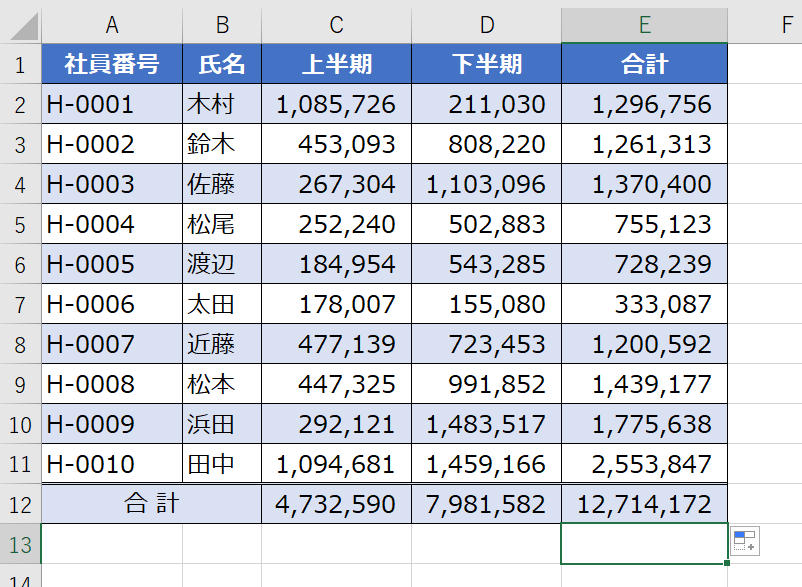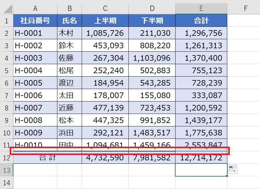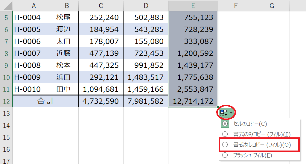 E2セルの薄い青色の塗りつぶしがすべてのセルにコピーされています。また、罫線もオートフィルした範囲すべてにコピーされています。そのため、最下部の合計行との境に合った罫線(二重線)も、一本線になっていますね。