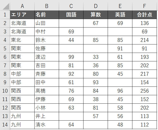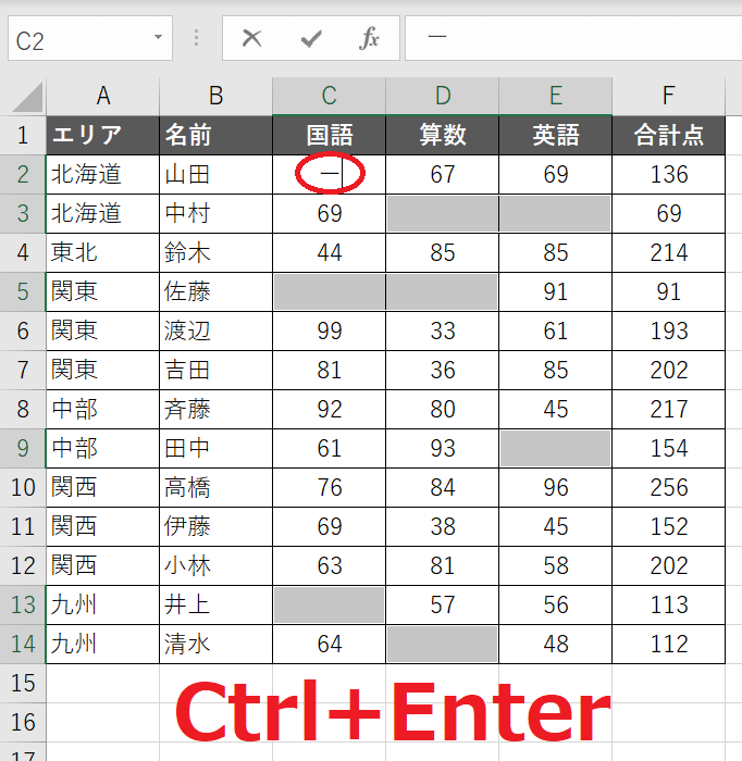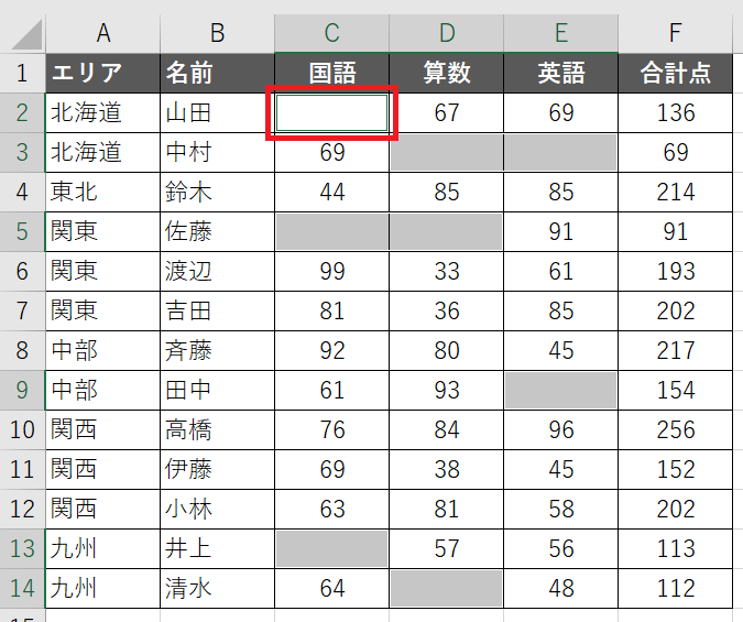 例えば、空白セルに「未受験」という文字列を入れてみましょう。Ctrl+Zで元の状態に戻しておきましょう。