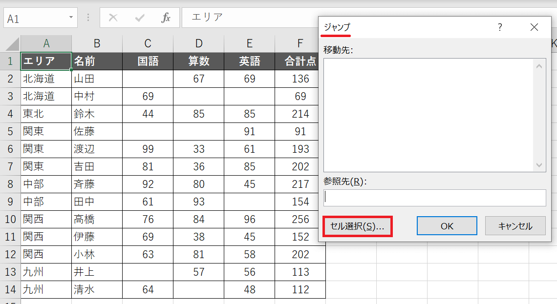 「ジャンプ」のダイアログが表示されます。「セル選択」の部分をクリックしてください。