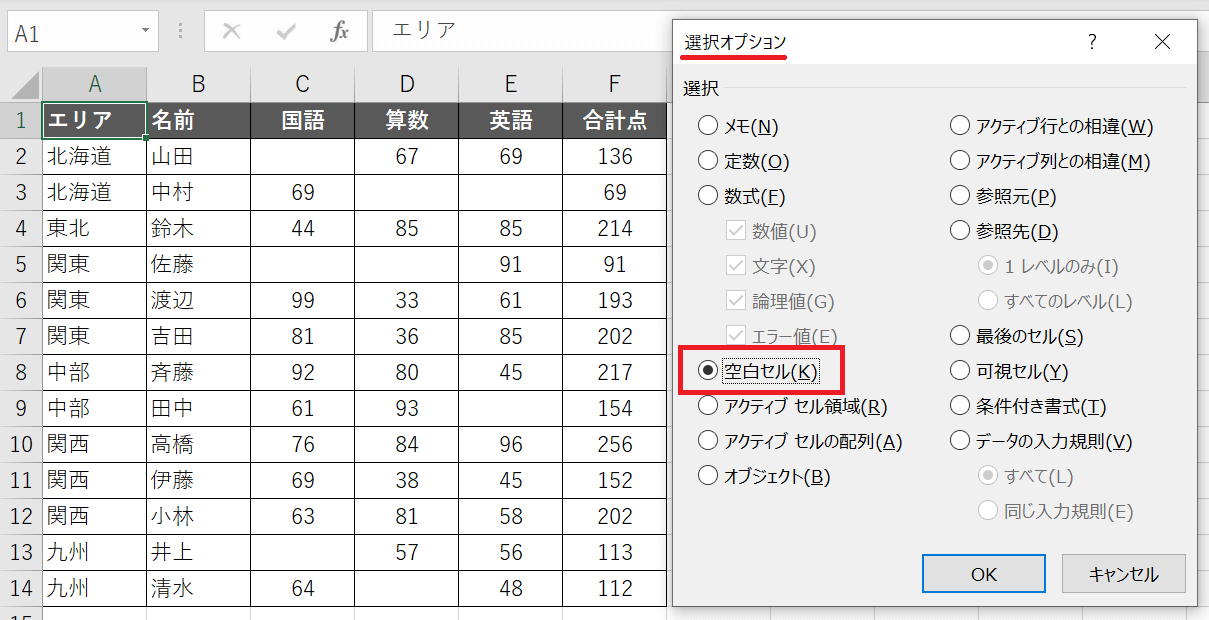 「選択オプション」が開くので、「空白のセル」にチェックを入れて「OK」します。