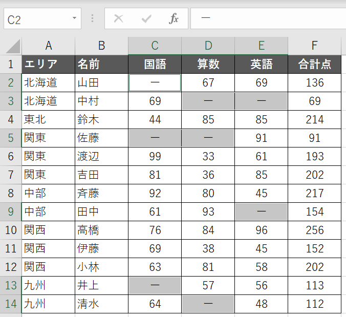 全ての空白セルに同じ値(ハイフン)が一括入力されました!かんたんですね。