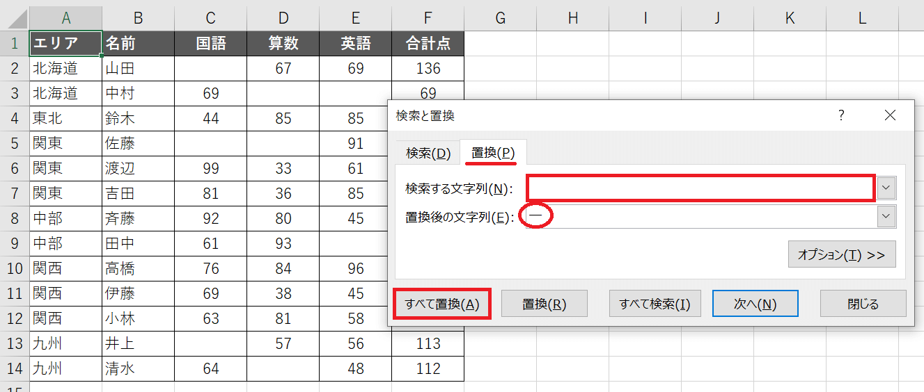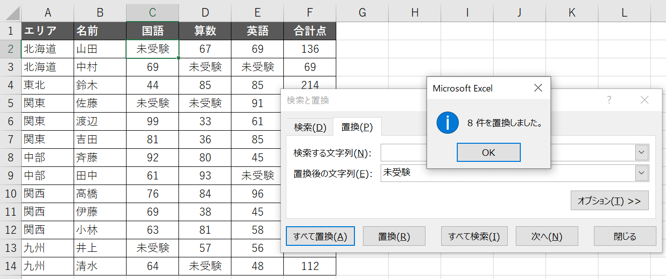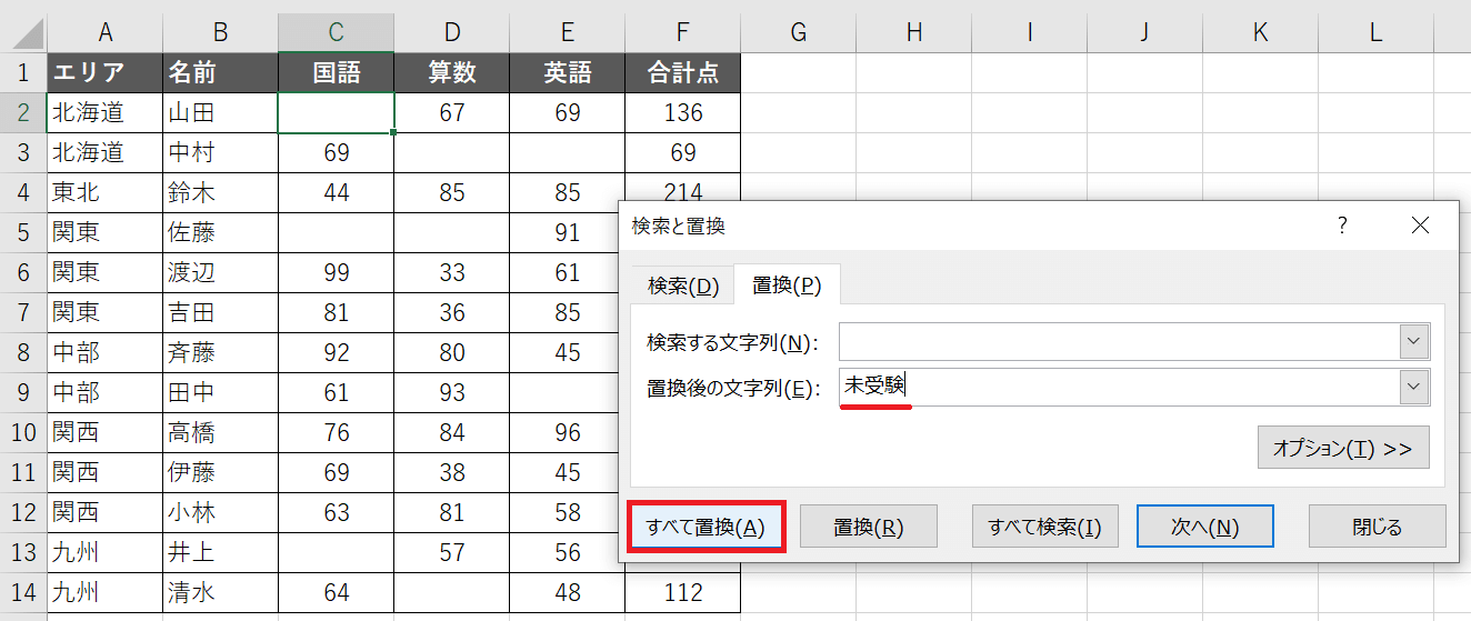 今度は「置換後の文字列」に「未受験」と入力します。その後「すべて置換」です。