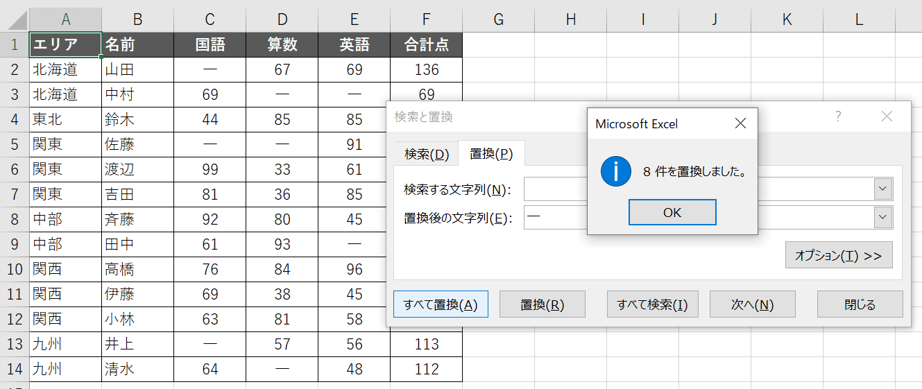 「8件を置換しました」と表示され、実際に空白セルが「-」に置換されています!