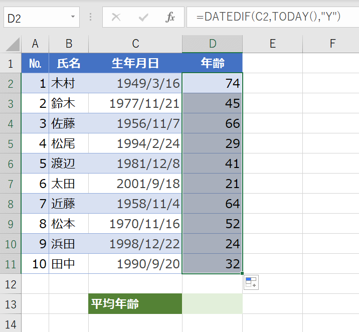 後はオートフィル機能で、全員の年齢を表示させます。かんたんですね。