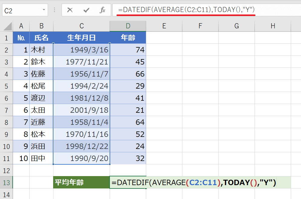 平均年齢を計算するポイントは、開始日にAVERAGE関数を使うことです。これによって平均生年月日が返されます。