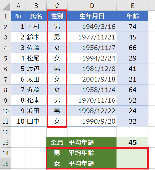 では、男女別の平均年齢を計算してみましょう。