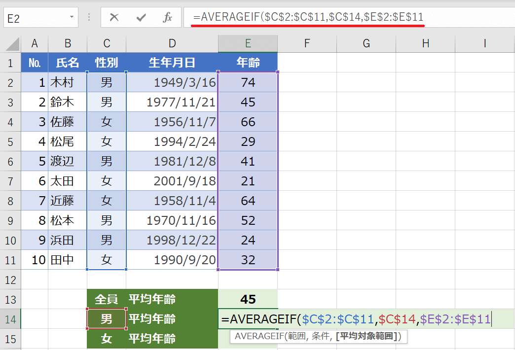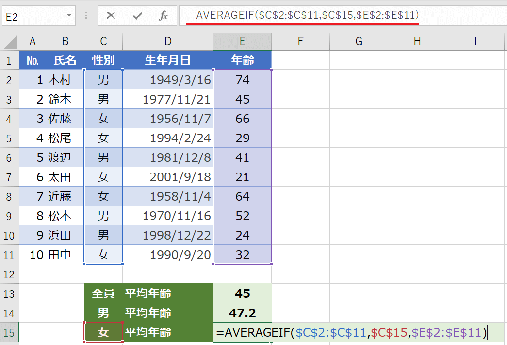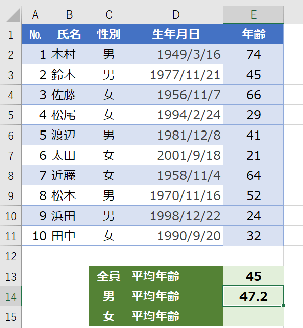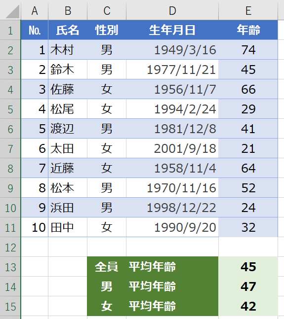 いかがでしたか。今回は生年月日から現在の年齢を自動で表示したり、そこから平均年齢を計算する方法でした。DATEDIF関数を使うとかんたんでしたね。AVERAGEIF関数を使えば、男女別の平均年齢も計算できます。