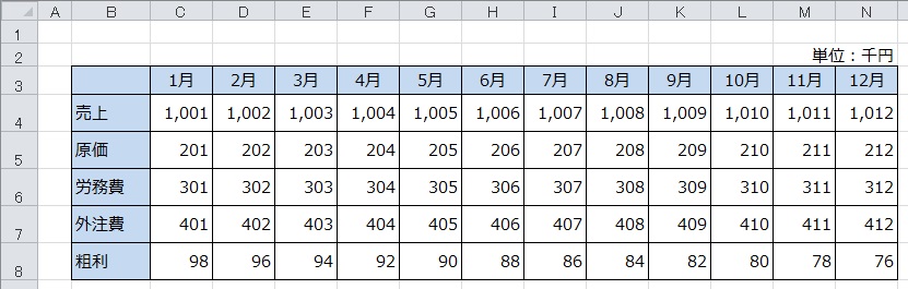 エクセルを使って縦方向と横方向の両方に項目が並ぶ表を作成することがあります。たとえば、下図のように縦方向には、売上~粗利の各項目があり、横方向には月が並ぶようなパターンです。