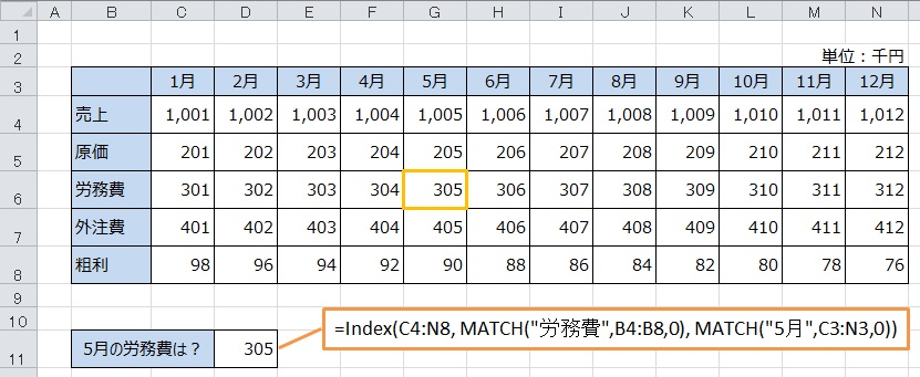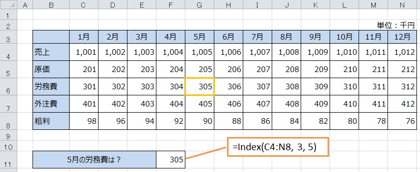 そして、労務費は上から3番目の項目、5月は左から5番目に位置します。それで、例にあるように「=Index(C4:N8, 3,5)」という計算式で5月の労務費を表示することができます。