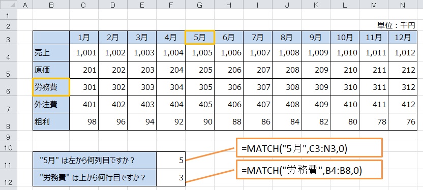 そうすると、例にあるように、「5月」は5列目、「労務費」は3行目という値を表示することができます。尚、ここでいう5列目、3行目というのは検索範囲内での相対的な位置です。