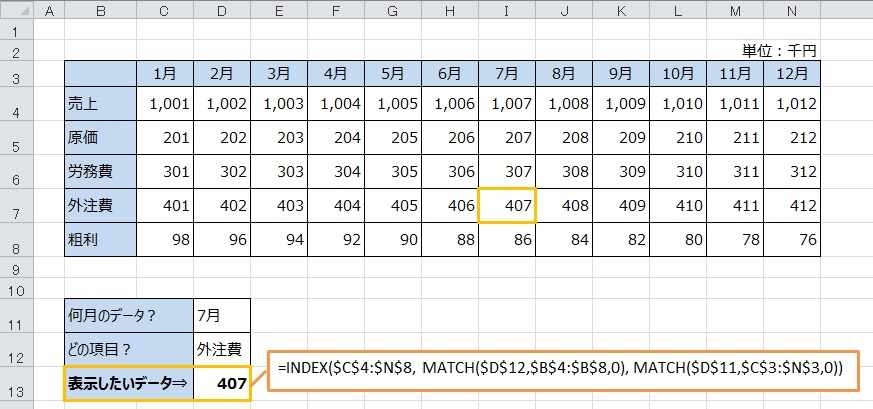 下図のように何月のどの項目のデータを表示させたいかを入力できるようにします。この例の場合、「7月」「外注費」と入力しますと該当するデータが表示されていますね。