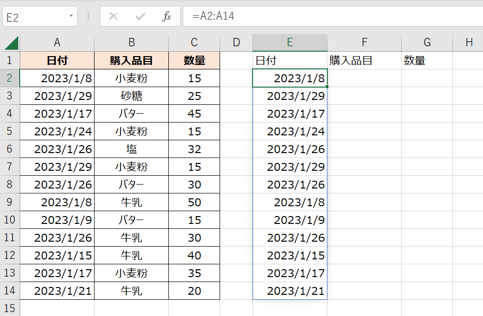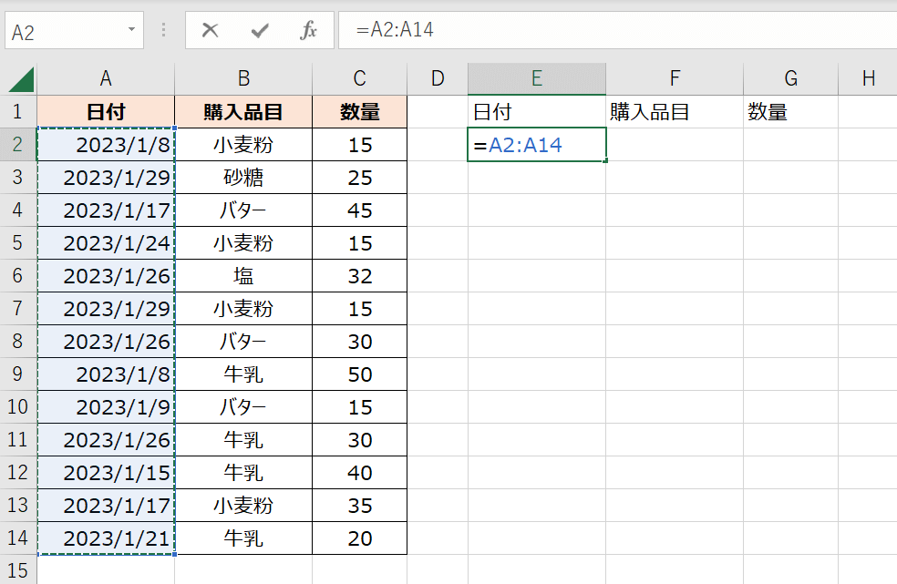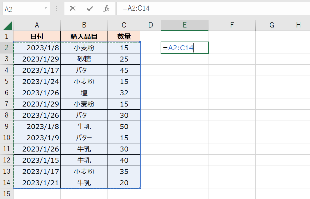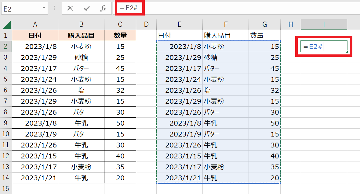 空白のセル(画像の場合、I2セル)に、=を入力した後、スピル領域(E2:G14)を選択してみてください。自動的に数式バーの表示は「=E2#」になります。