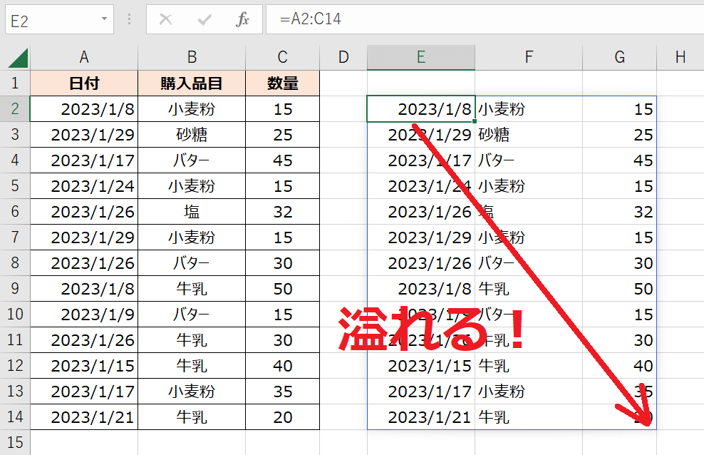 画像の通り、スピル領域に値がある場合、どうなるでしょうか。E2にスピルの数式を入力してみます。