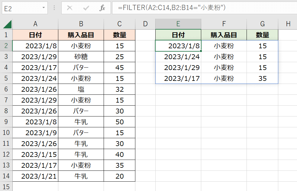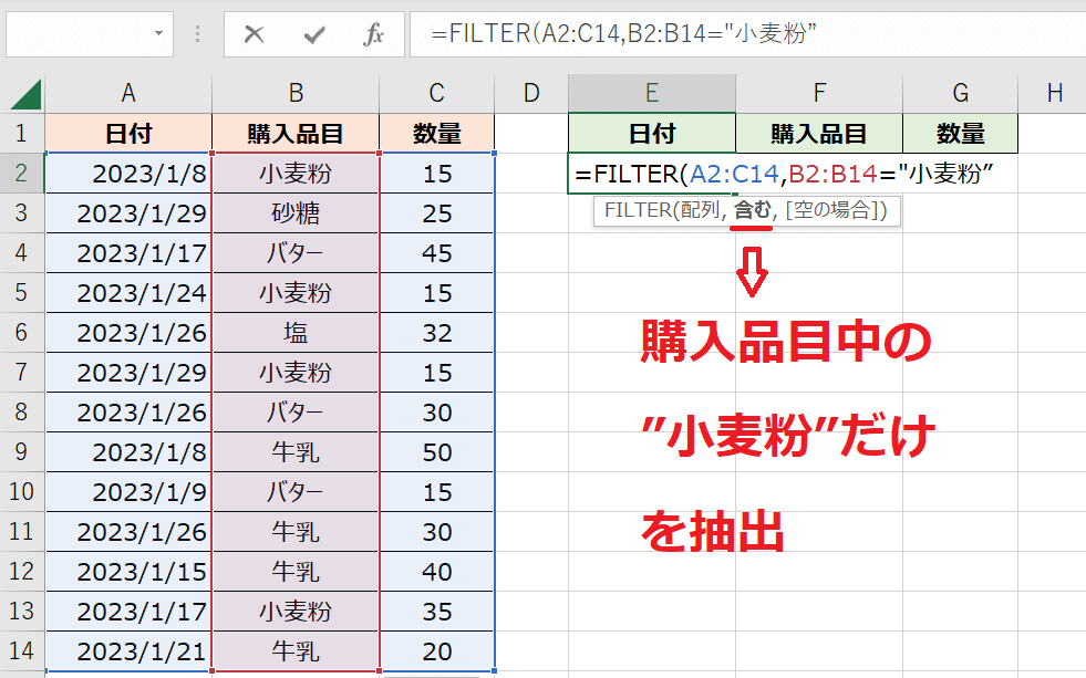 例えば、購入品目の中から小麦粉だけのデータを抽出したいという場合です。第2引数の[含む]は、購入品目(B2:B14)の中から、文字列”小麦粉”を指定してみます。