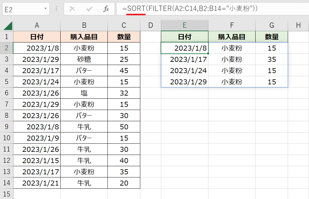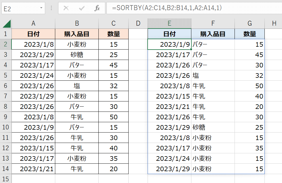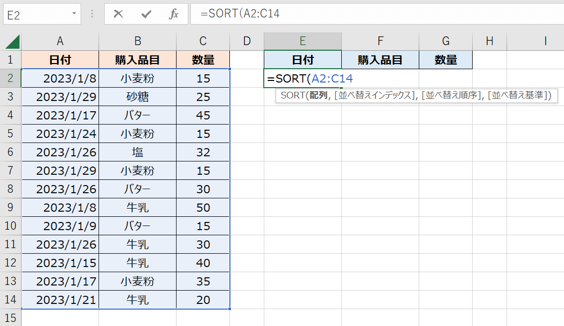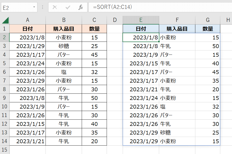日付の列で昇順されたことが分かります。引数を指定すると、SORT関数の意味がつかめます。