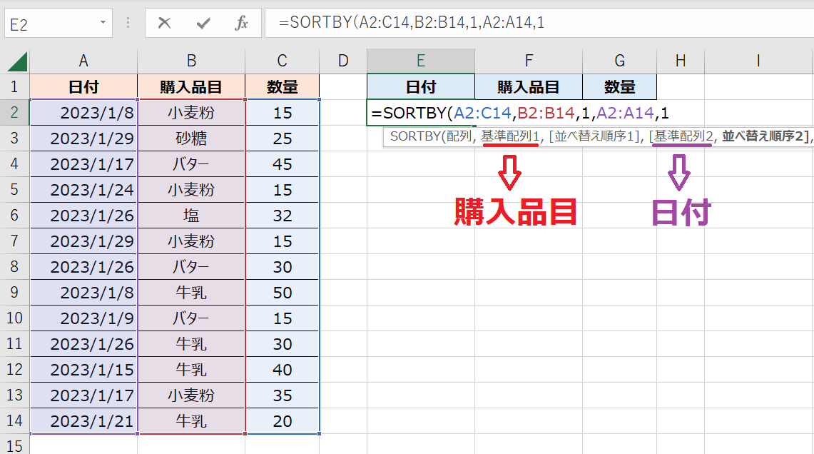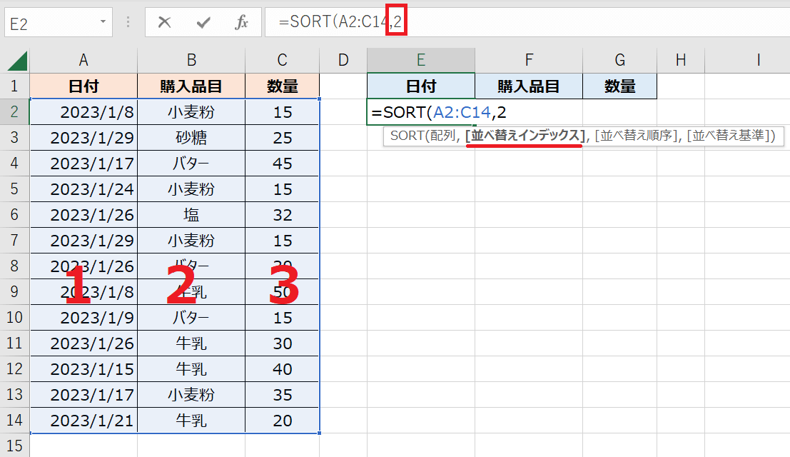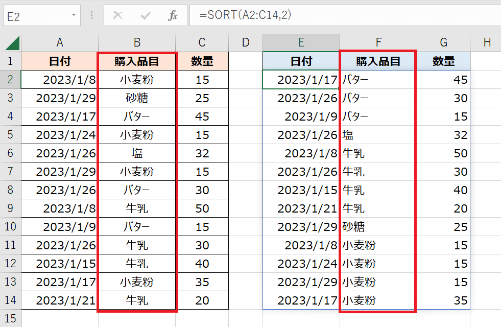同じようにSORT関数を使い、第2引数[並べ替えインデックス]を指定してみましょう。これはVLOOKUP関数などの”配列”と同じです。1なら1列目の「日付」を基にします。(省略した場合も1です)2なら2列目の「購入品目」を基にします。画像のように、2を指定すれば、結果はもうお分かりの通りです。
