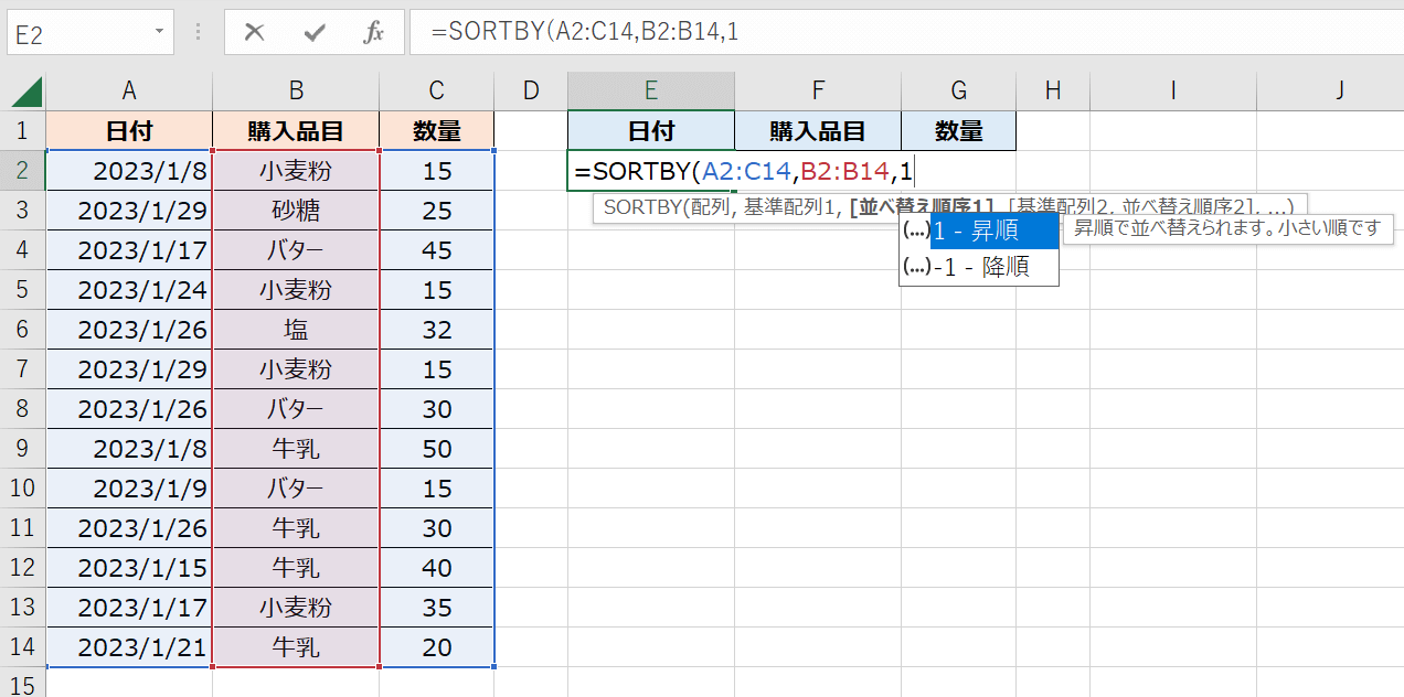 2列目の購入品目を基準に昇順の並び替えがされます。ちなみに、第3引数の[並べ替え順序]は、昇順なら1、降順なら-1で指定できます。