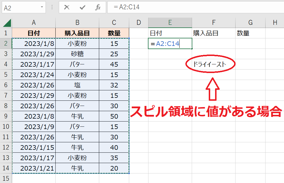 スピル領域にある値(画像の場合「ドライイースト」)を削除すれば、スピルします。ゴースト部分に後から値を入れてもエラーになります。しかし、その値を消すと元通りスピルします。この点は注意が必要ですね。
