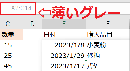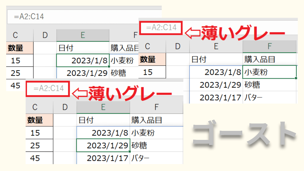 親となるセル以外は、数式バーのテキストが薄いグレーになっており、これをゴーストと呼びます。