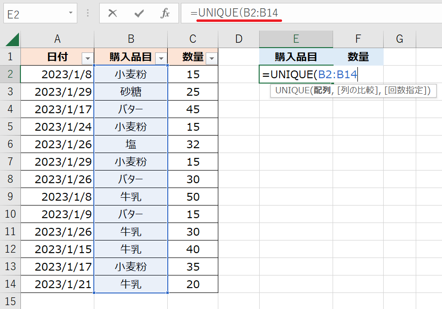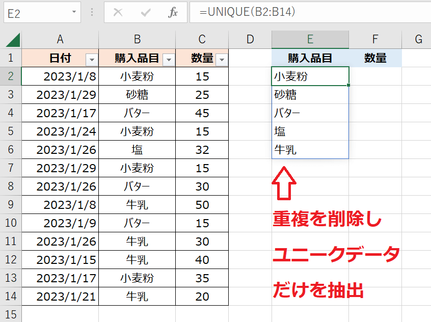 画像の通り、E2セルにUNIQUE関数を入力し、配列はテーブルになっている表の「購入品目」データを指定します。この状態でEnterするとどうなるでしょうか。