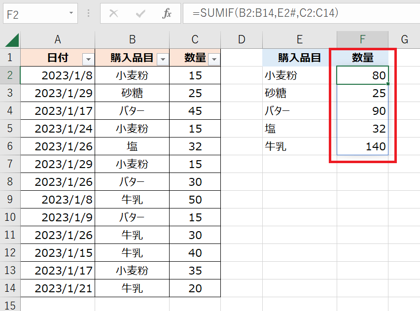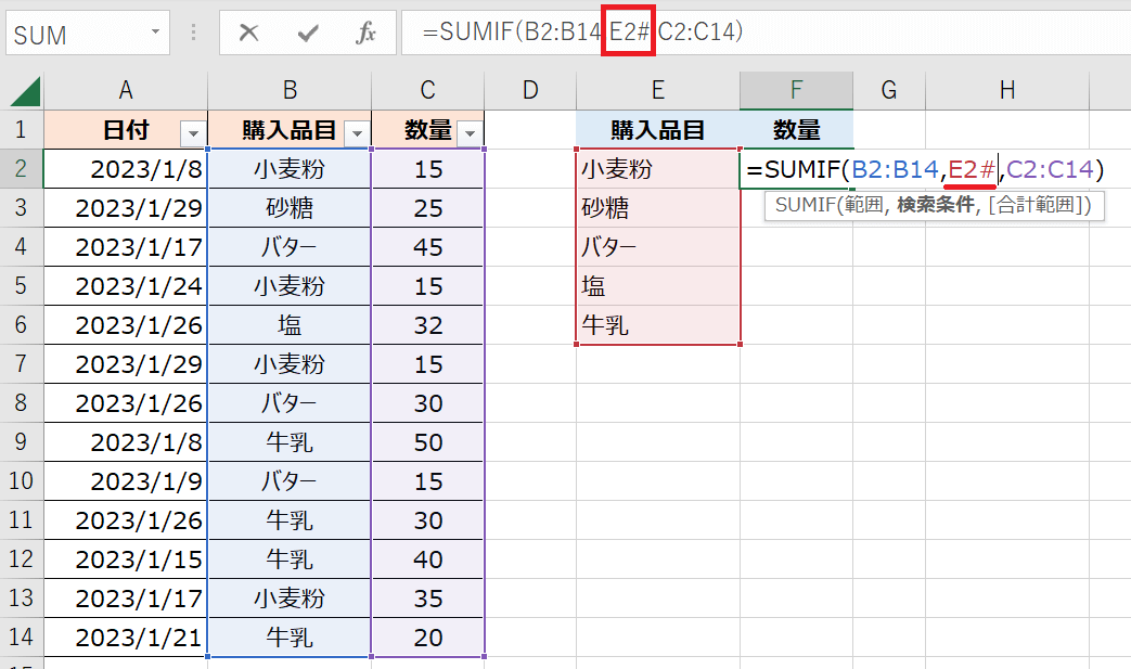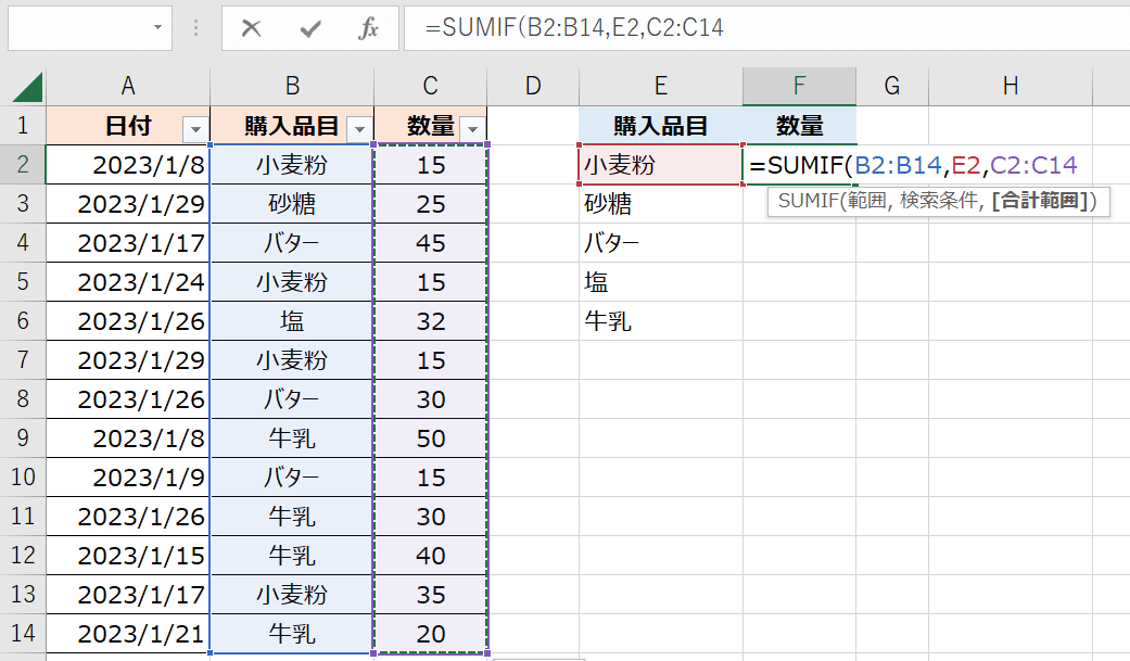 通常SUMIF関数単体で使う場合です。F2セルで、範囲に「購入品目」のデータ範囲を指定し、検索条件は”小麦粉”を意味する「E2」セルを指定します。[合計範囲]は「数量」のデータ範囲になります。