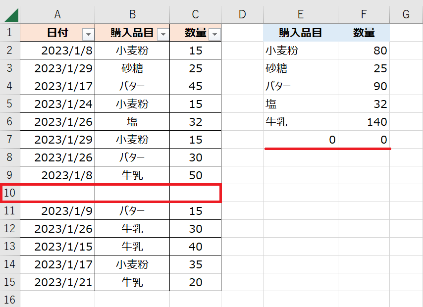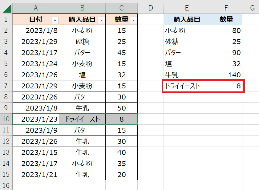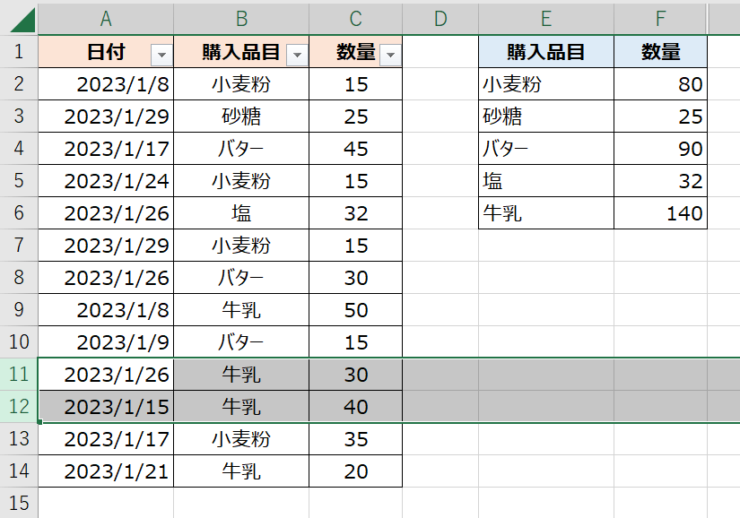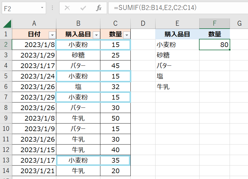 こうすることで、小麦粉だけの数量(水色囲み部分)が合計されて「80」と表示されました。
