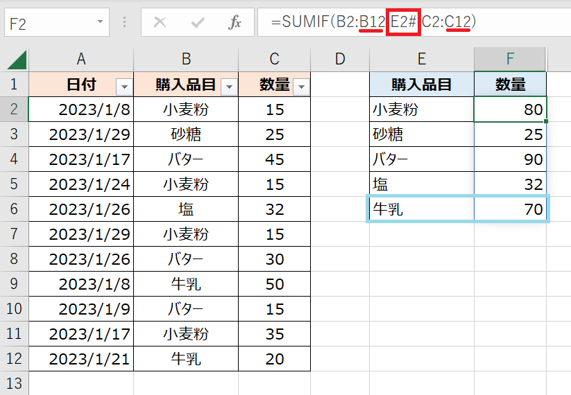 ここでスピル機能を上手に使うと、一括で品目ごとの数量を集計できます。F2セルでオートフィルを使えば、F6(牛乳)までの合計が出ますが、前述したスピル範囲演算子を使うともっとかんたんで便利です。