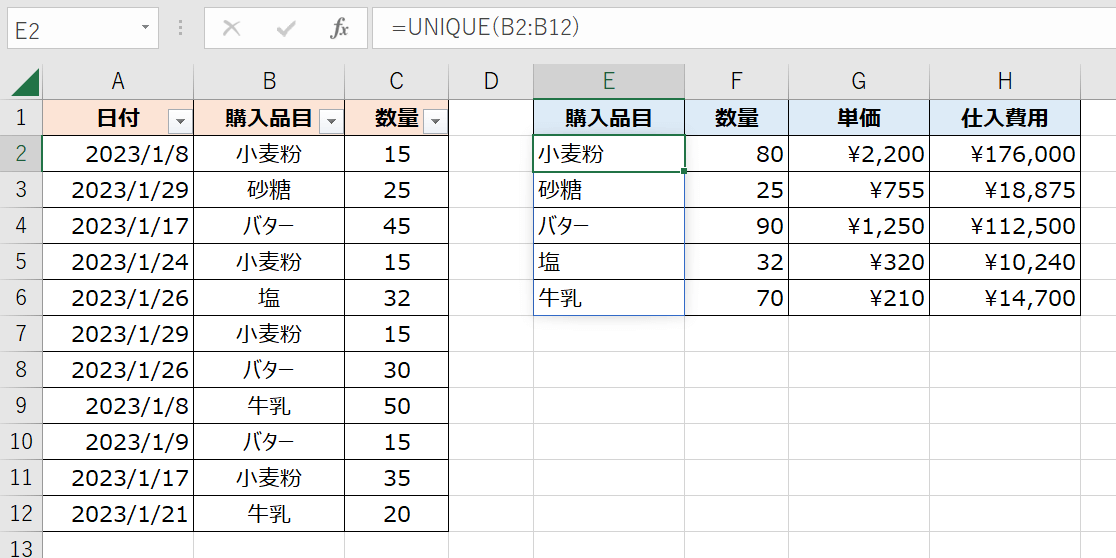 例えば、購入品目ごとの数量を集計したい場合にUNIQUE関数が使えます。
