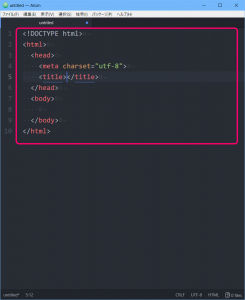 HTMLファイルの基本的な構造は定型文になりますので、ページを作成するたびに決まった表現になります。毎回ファイル(ページ)を作成するたびに打ち込むのは大変ですが、以下の手順でAtom(テキストエディタ)で自動的に生成できます。