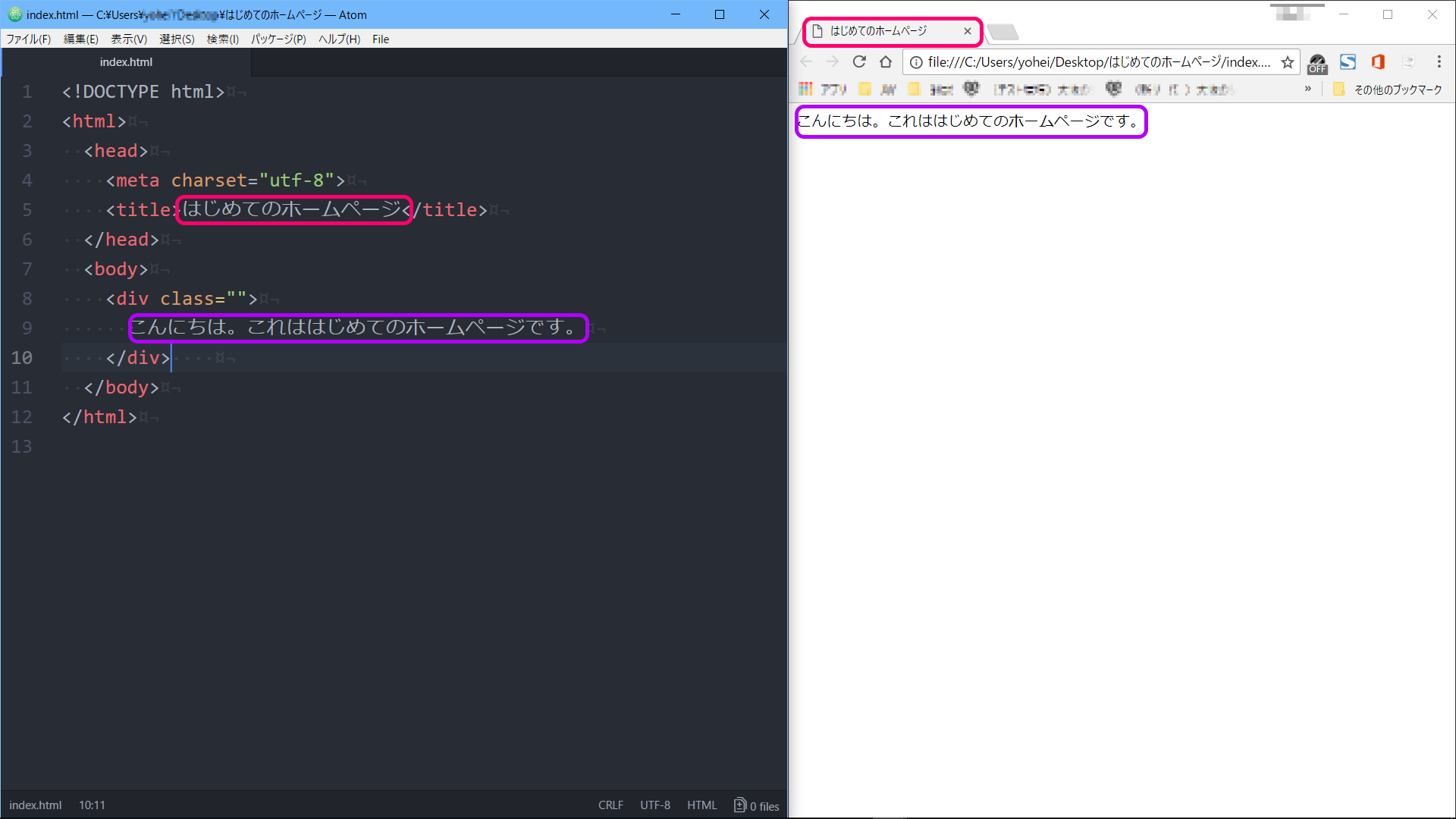 今後HTMLファイルを作っていくときには、画面の一方にテキストエディタもう一方にブラウザを表示させておくと便利です。更新するたびに、ブラウザの「ページの再読み込み」を行なえば、作ったプログラムがどのように表示されているかをすぐに確認できます。