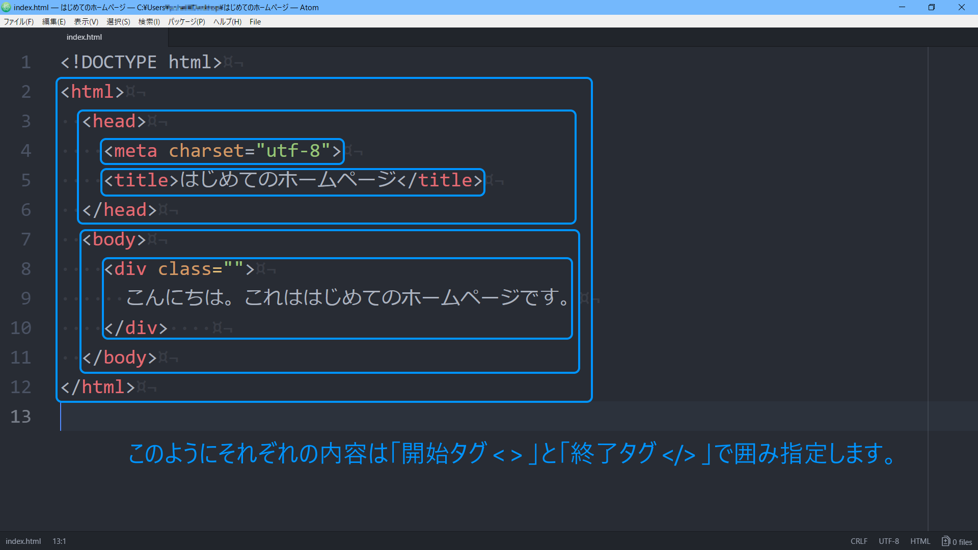 HTMLは基本的に <開始タグ> と </終了タグ> で囲われた部分に内容を記入していきます。