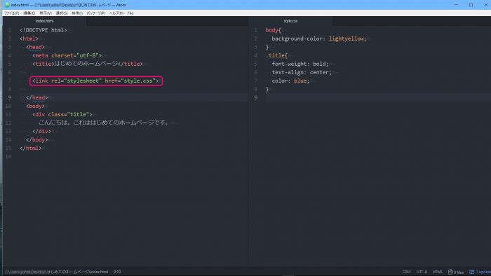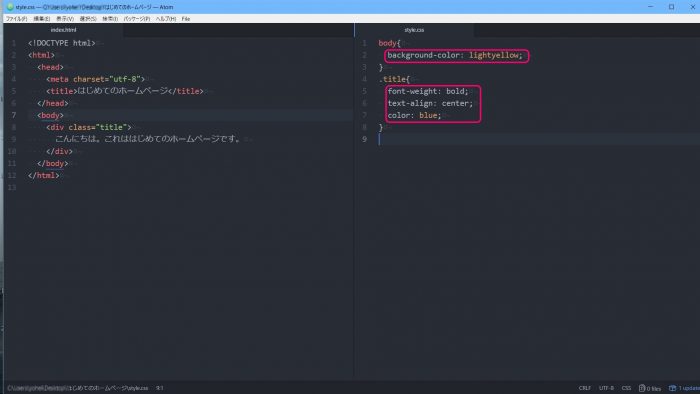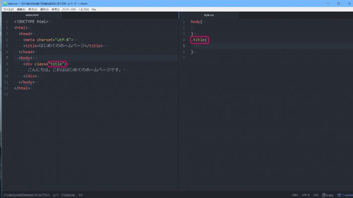 下の画像の左がHTMLファイル、右側がCSSファイルです。CSSファイルに「body」と「.title」を記入します。