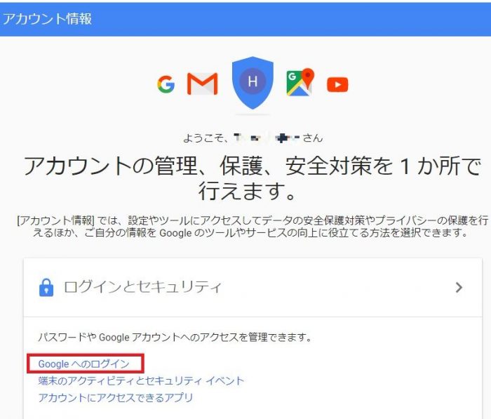 2.「アカウント情報」ページが表示されたら、「Googleへのログイン」をクリックします。