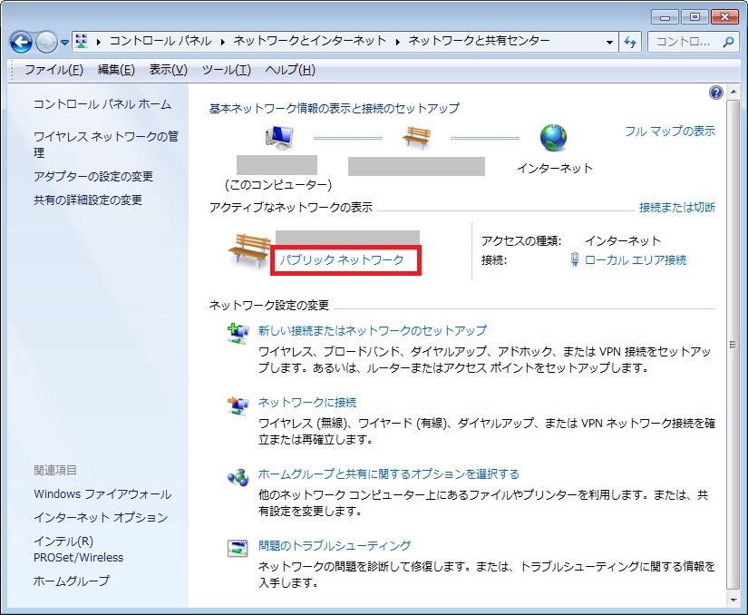 この画面で赤で囲まれた箇所を見ると、現在のネットワークが「ホームネットワーク」か「社内ネットワーク」か「パブリックネットワーク」かが分かります。パブリックという表現から他のコンピュータと繋がりやすいとイメージされるかもしれませんが、実際にはコンビニやコーヒーショップといった不特定多数の人がつながっているネットワークへの接続を意味しますので、セキュリティ的には一番高いレベルの設定ということになります。