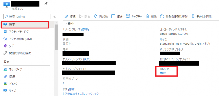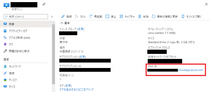 再度、[ホーム]-[Virtual Machines]からRedmineがインストールされている仮想マシンを選択します。今度はDNS名が表示されています。DNS名はあとで必要になりますので、メモしておきましょう。