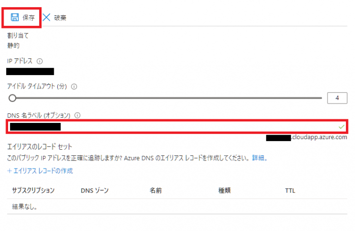 DNS名ラベルを入力します。お好みの名称で大丈夫です。入力後、「保存」ボタンをクリックします。