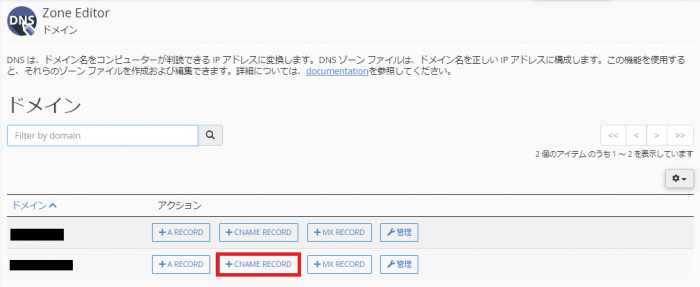 次に、対象のドメインの「+CNAME RECORD」ボタンをクリックします。