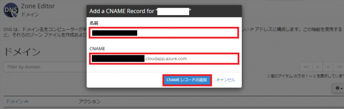 • CNAME:AzureポータルでメモしたDNS名を入力します。