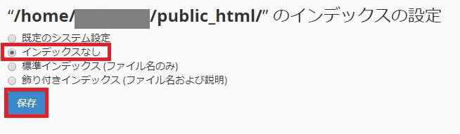 すると、インデックスの設定画面に遷移します。そこで「インデックスなし」を選択し、「保存」ボタンをクリックします。