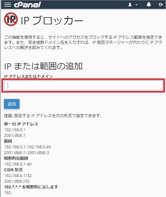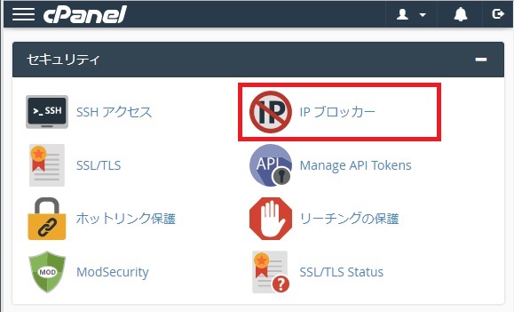 IPアドレスが特定できたら、あとはそのIPアドレスからのアクセスをブロックするだけです。今度は、cPanelのメニューから「IPブロッカー」を選択します。