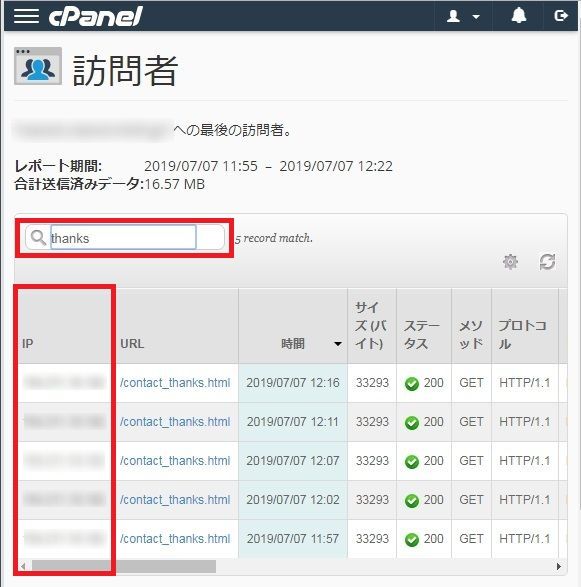 さきほどコピーしたURLの一部を検索窓に入力し、検索します。お問合せフォームへのアクセスだけが表示されます。5分おきに問い合わせがなされていることが分かります。「IP」列にIPアドレスが表示されています。そのIPアドレスからのアクセスをブロックする必要があります。ここでIPアドレスをコピーしておきましょう。