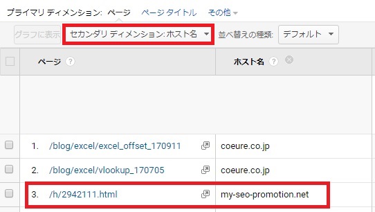 すると「/h/*******.html」という当社サイトには存在しないURLへのアクセスが記録されていました。[セカンダリ ディメンション]-[ホスト名]を選択して確認したところ、当社ドメインとは異なるドメイン名が表示されていることが分かりました。