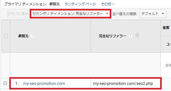 さらに、[セカンダリ ディメンション]-[完全なリファラー]を選択するとどのページからリンクが張られているかを見ることができました。