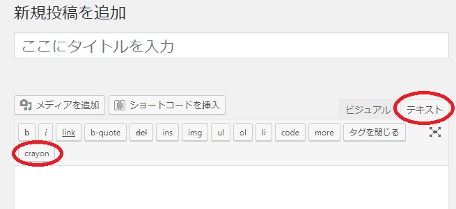 投稿欄には、「ビジュアル」タブと「テキスト」タブがありますが、「テキスト」タブを選択し、crayonボタンをクリックします。crayonボタンをクリックすると下図の画面が表示されます。