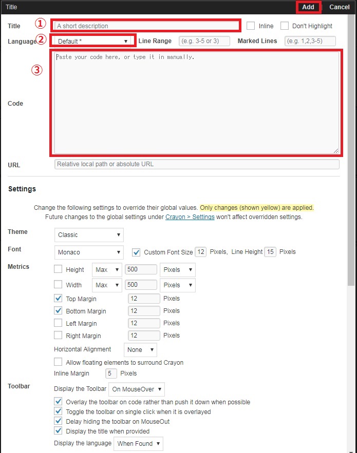 「code」欄にプログラムコードを記述したら、あとは右上の「add」をクリックするだけです。Settingsでいろいろとデザインの変更なんかもできるようですが、結局はデフォルトが一番しっくりきたのでそのままで使っています。