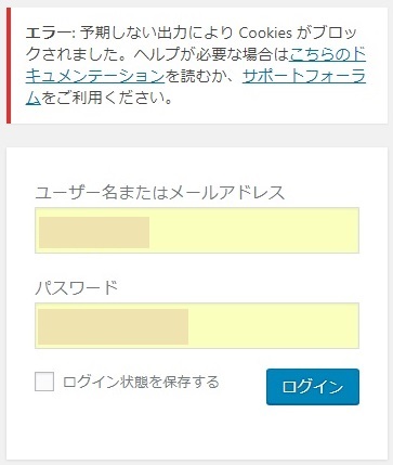 ワードプレスの管理画面を開こうとしたところ、「エラー: 予期しない出力により Cookies がブロックされました」というエラーが表示されました。管理画面にログインすることができない状態です。